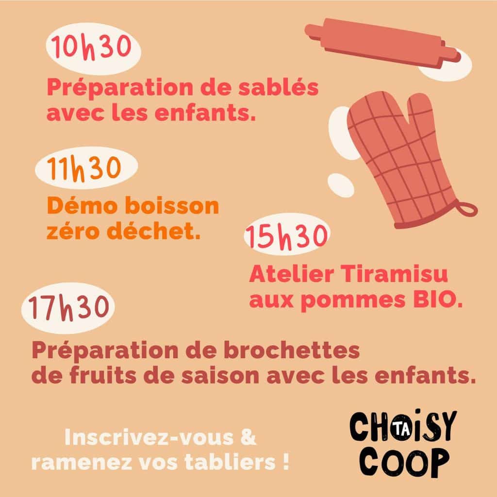 4 ateliers cuisine autour de la pomme ont été mis en place à partir de 10h30, infos et réservation à la Coop. Venez partager vos meilleures spécialités sucrées et salées à base de pomme.
