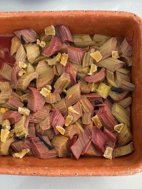 Afin d’éviter une consistance trop aqueuse, et pour garder aux tiges leurs belles nuances de couleurs, la compote de rhubarbe peut se cuire au four.