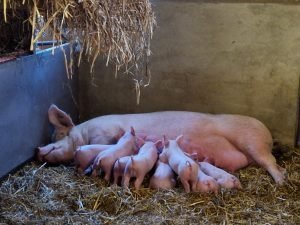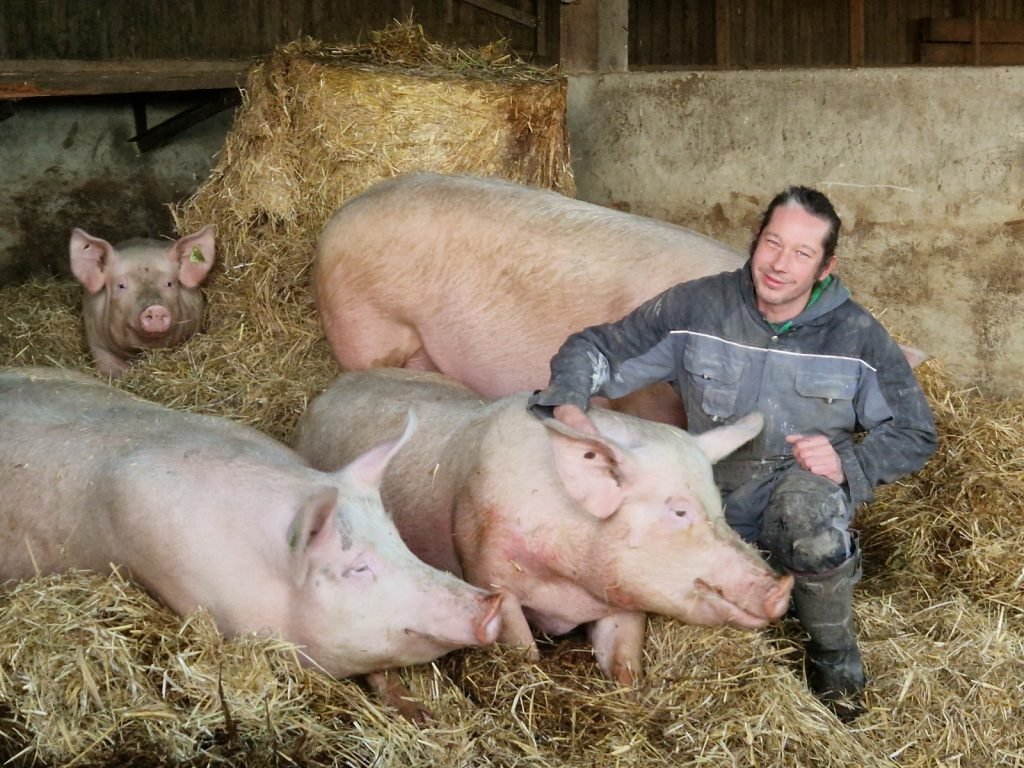 Il élève exclusivement des porcs suivant le cahier des charges de l’Agriculture Biologique : sur paille, avec un accès plein air, et nourris grâce aux 60 ha de cultures répartis en treize parcelles labourables drainées qui permettent de cultiver triticale, orge d’hiver et de printemps, féverole, maïs et luzerne.