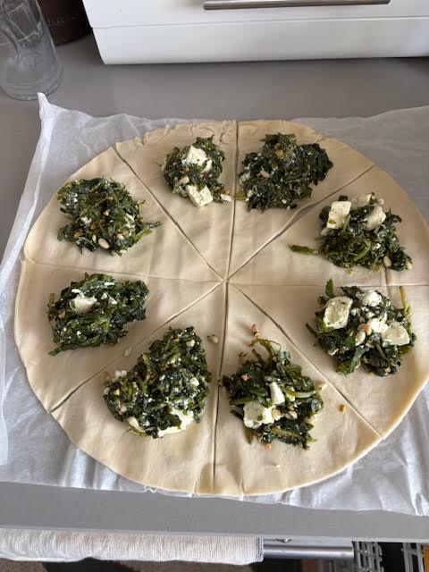 Bien égoutter les épinards dans une passoire fine. Mélanger la féta détaillée en petits cubes avec tous les ingrédients. Suivant vos goûts et les stocks disponibles dans vos placards, les pignons peuvent être remplacés par d’autres fruits à coque hachés menu. Les raisins secs sont une option. Ajouter les épinards égouttés et mélanger.