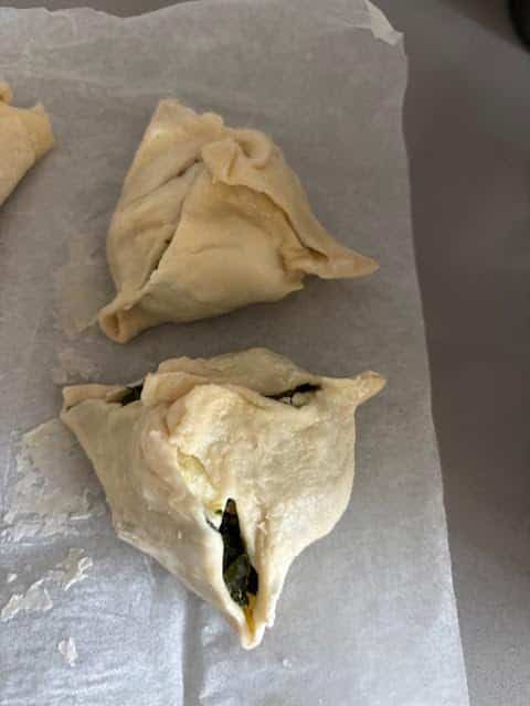 Dérouler la pâte feuilletée et diviser la en 4 ou 8 sections selon la taille souhaitée des böreks. Répartir la farce dans les triangles ainsi formés et plier la pâte en joignant les 3 pointes de chaque triangle et collant la pâte des arrêtes du bout des doigts. Badigeonner de lait ou de jaune d’oeuf pour un effet doré et enfourner 15 à 20 mn dans un four préchauffé à 180°C.