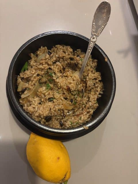 Une fois le riz cuit, retirer du feu et incorporer les oignons, le jus de citron, l’ail noir découpé en tranches fines, saupoudrer de persil haché et servir possiblement agrémenté d’une CàS de yaourt grec.